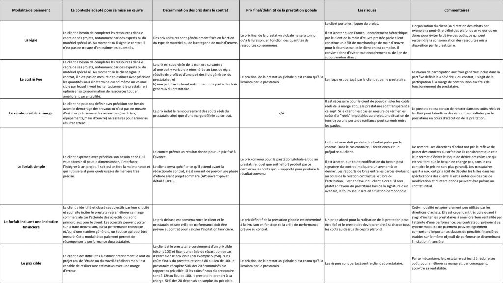 L’une des principales problématiques lors de la structuration des contrats des projets est la recherche de la modalité de paiement la plus adaptée en fonction de l’identification des besoins du client, de sa volonté à inciter le prestataire à optimiser ses ressources et/ou de procéder à un partage des risques.